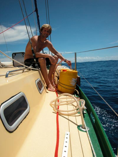 We carried around 1000 litres of fuel anticipating light winds in the Pacific. Here Woody fills the ships tanks from the 14, 20 litre cans on deck.
