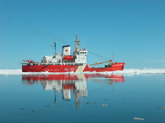 As the 'Laurier' steams away, they show off by breaking a little ice